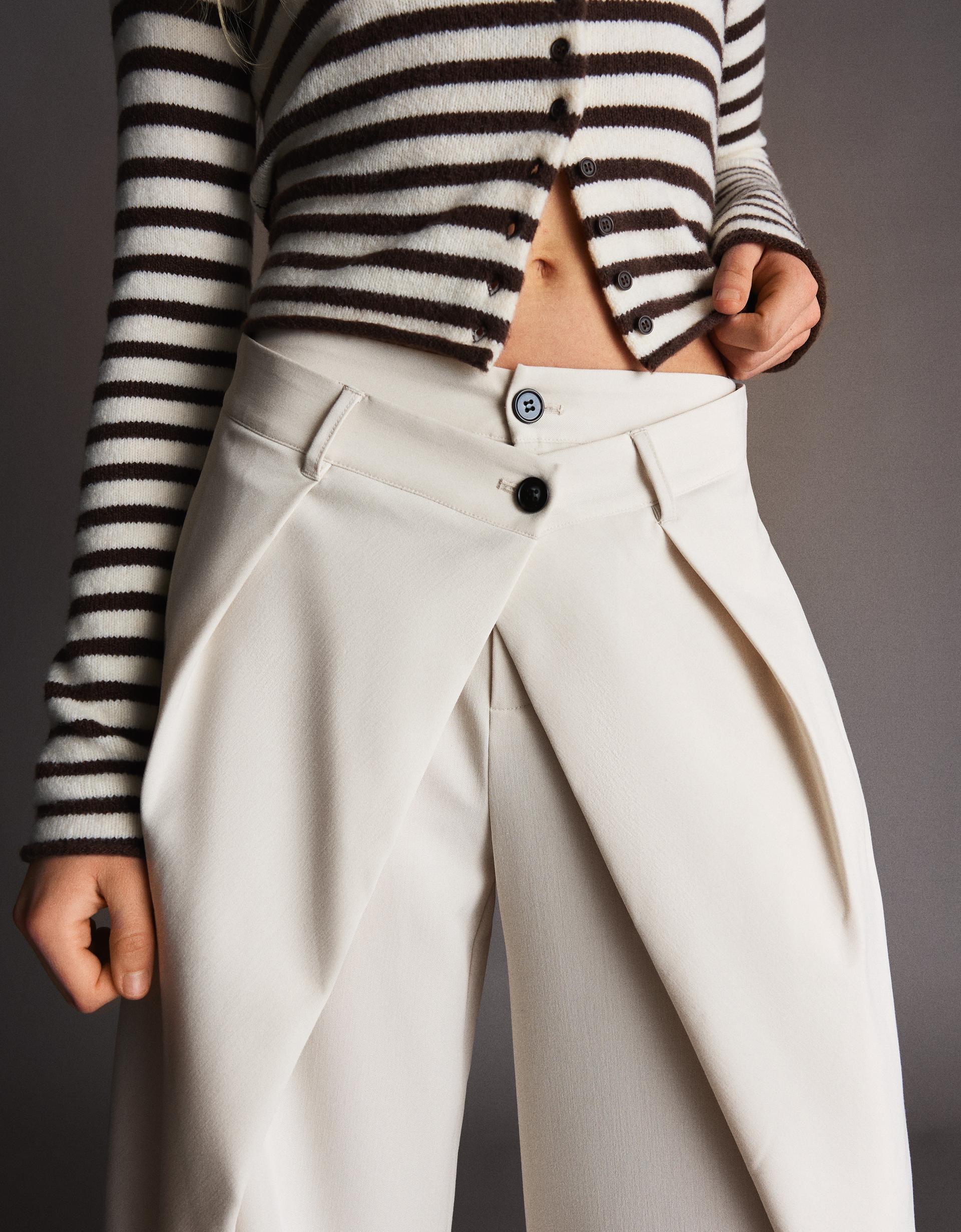 Sculptural tailoring meets effortless elegance in these wide-leg trousers, designed for the modern minimalist. Crafted from premium structured fabric, they feature a distinctive asymmetric front pleat detail and a high-rise waist with subtle button closure.