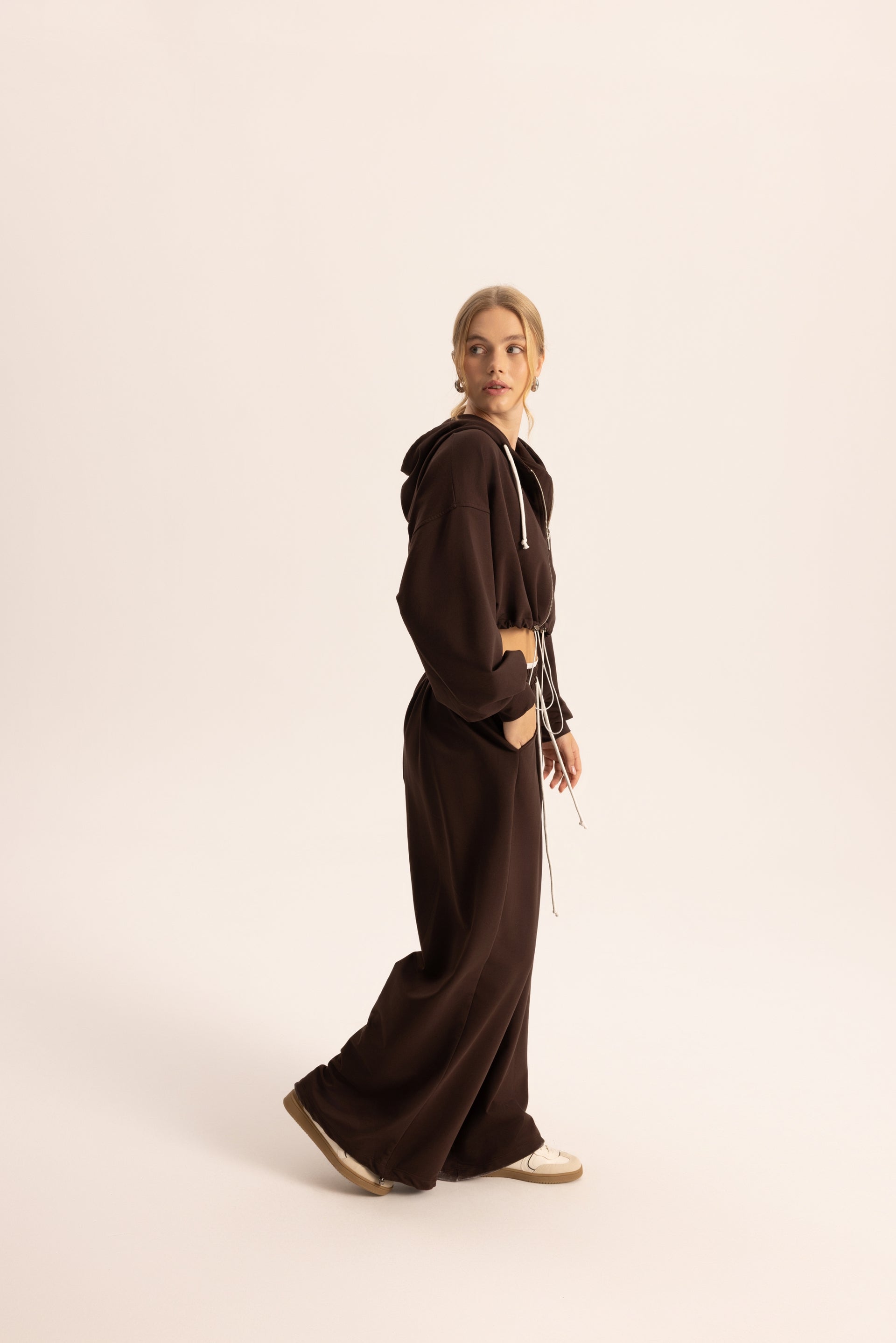 Crafted from sumptuous fabric with a subtle sheen, this set elevates everyday comfort to new heights. The cropped hoodie features a functional zip closure and adjustable drawstring hood, while the high-waisted wide-leg trousers with contrast drawstring create an elongated, elegant silhouette. Perfect for the modern woman who values both style and comfort.