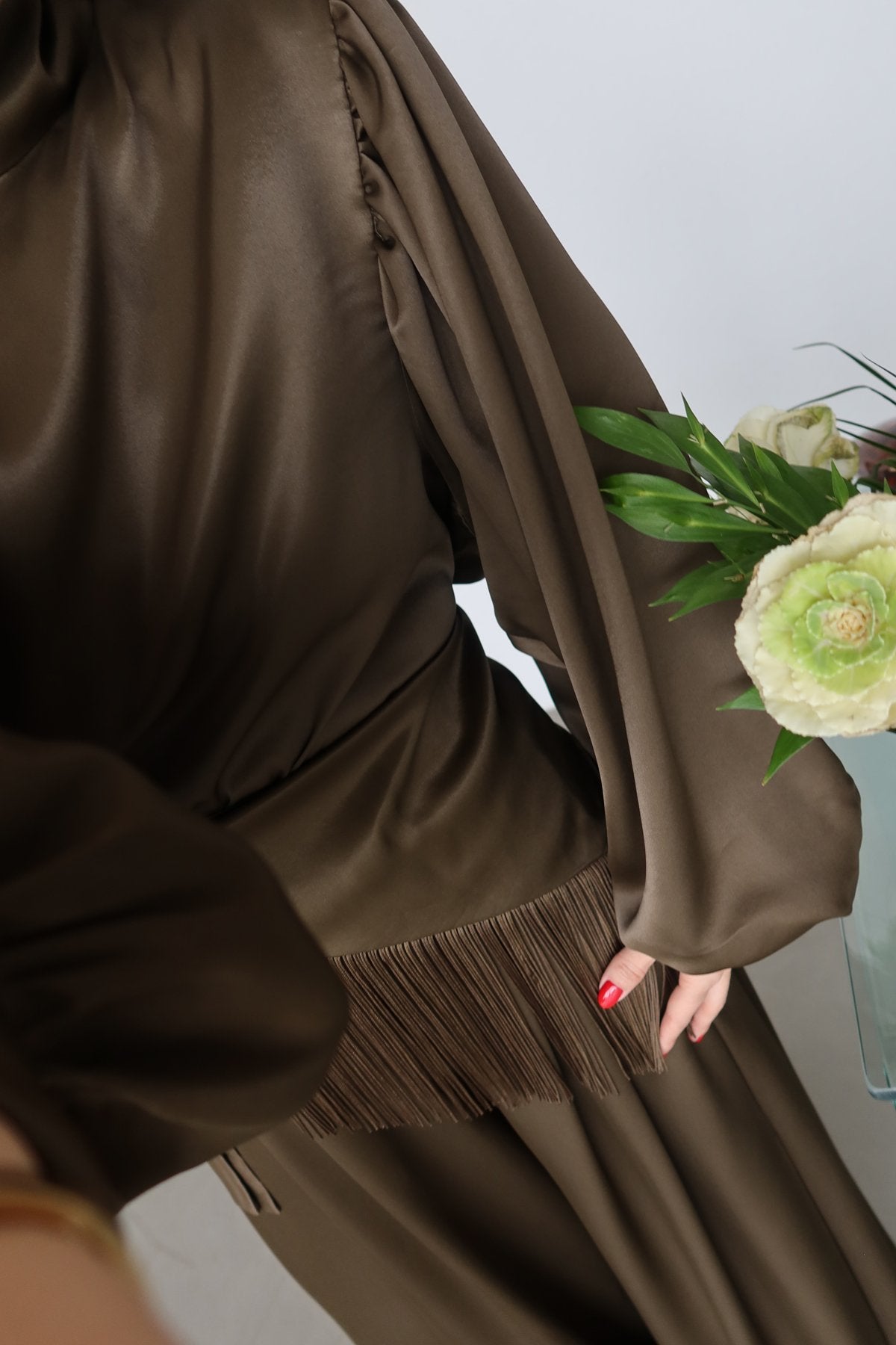 Elevate your wardrobe with the Olive Éclat Silk Set, a refined statement of modern elegance and effortless luxury. Crafted from premium silk satin, this set features a fluid high-neck top with soft voluminous sleeves and an artfully draped silhouette that glides over the body with a luminous finish.