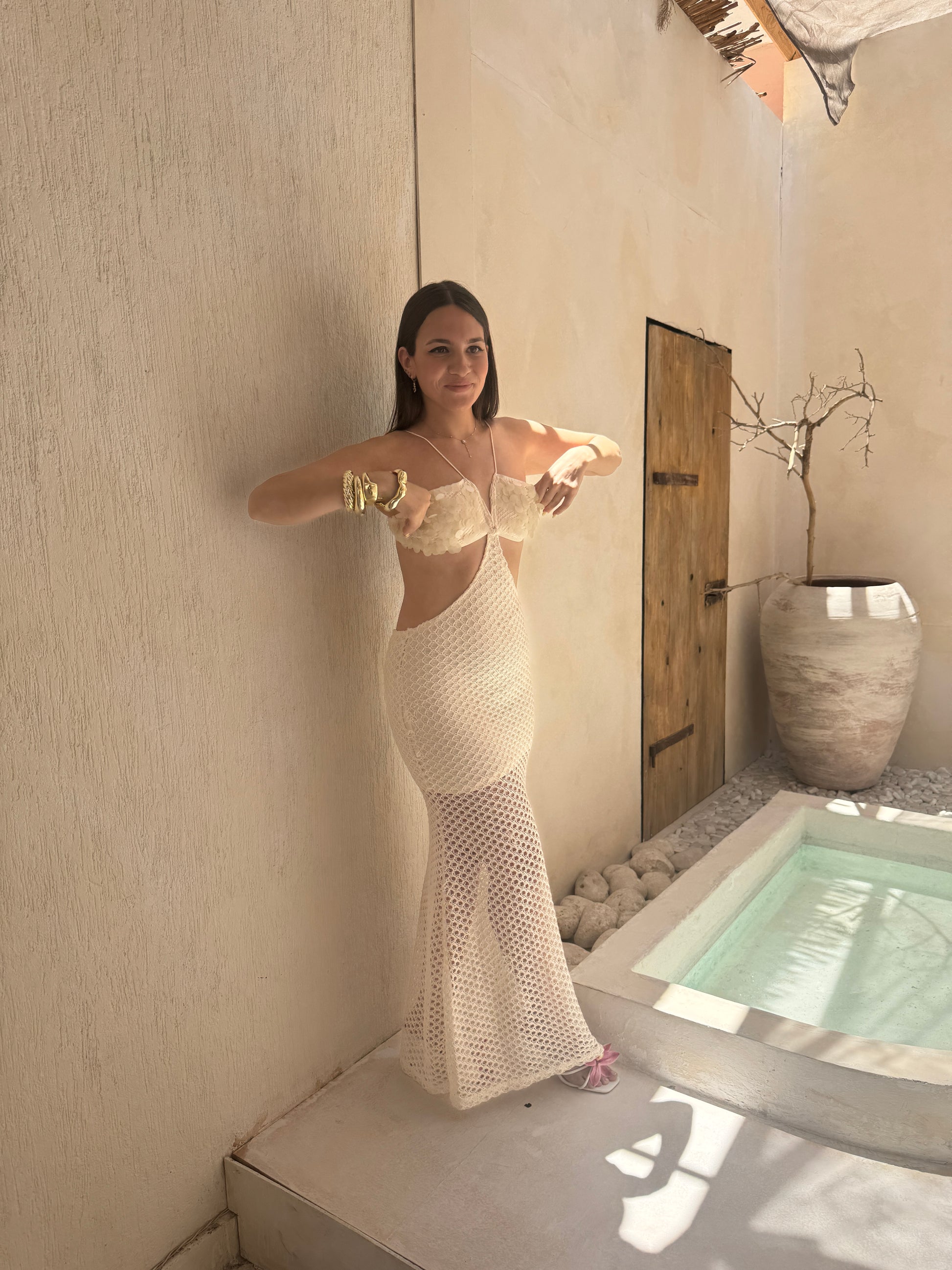 Unleash your boheme side with the Shell Maxi Dress in luxurious Crochet fabric. This sultry, crochet with sequin shell masterpiece features a daring plunging cowl neckline and an alluring open back with delicate tie details. The fluid, floor-sweeping silhouette hugs your curves, exuding effortless elegance and fierce sophistication. Perfect for making a bold statement at glamorous events or tropical escapes, the Shell is where untamed allure meets timeless grace.