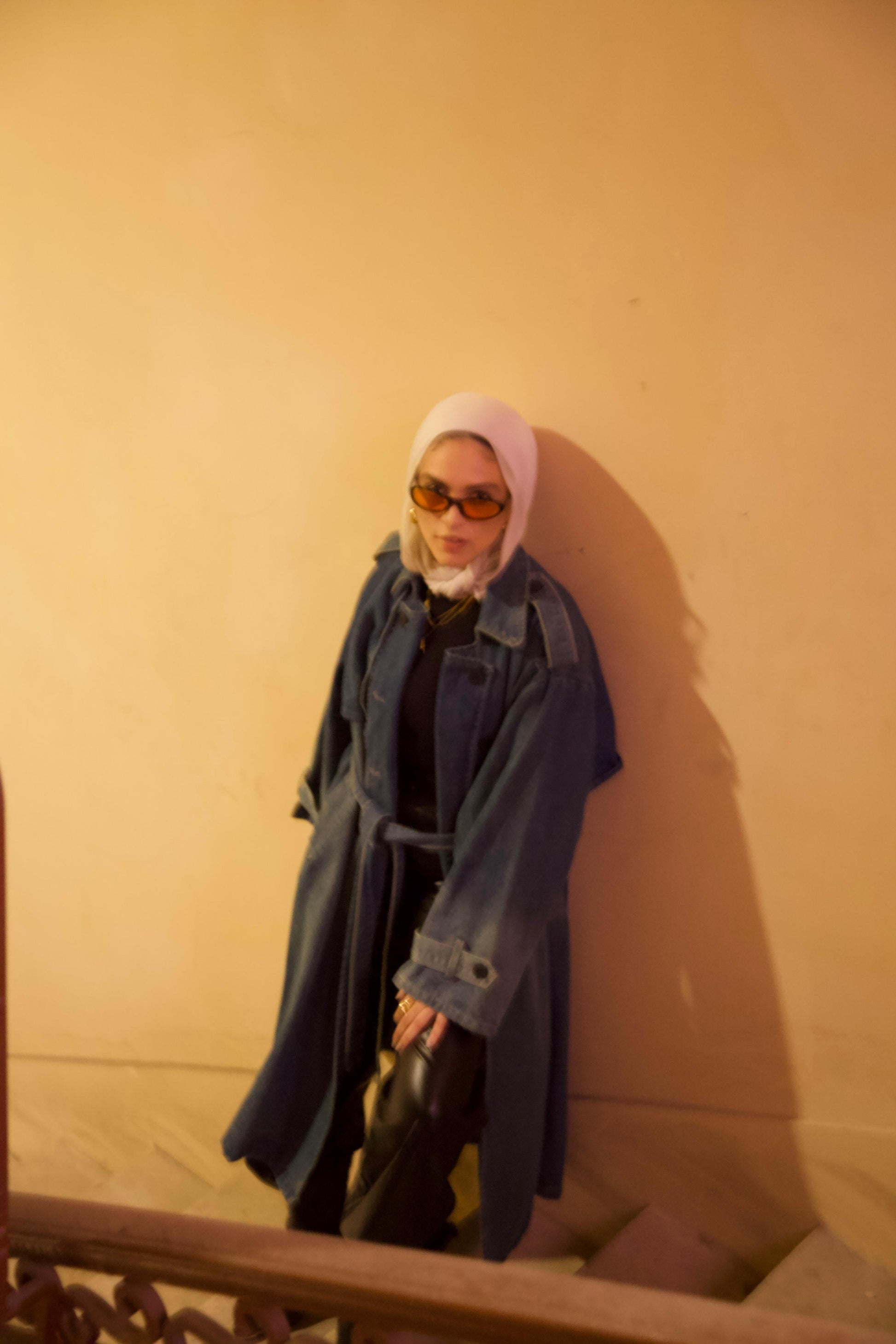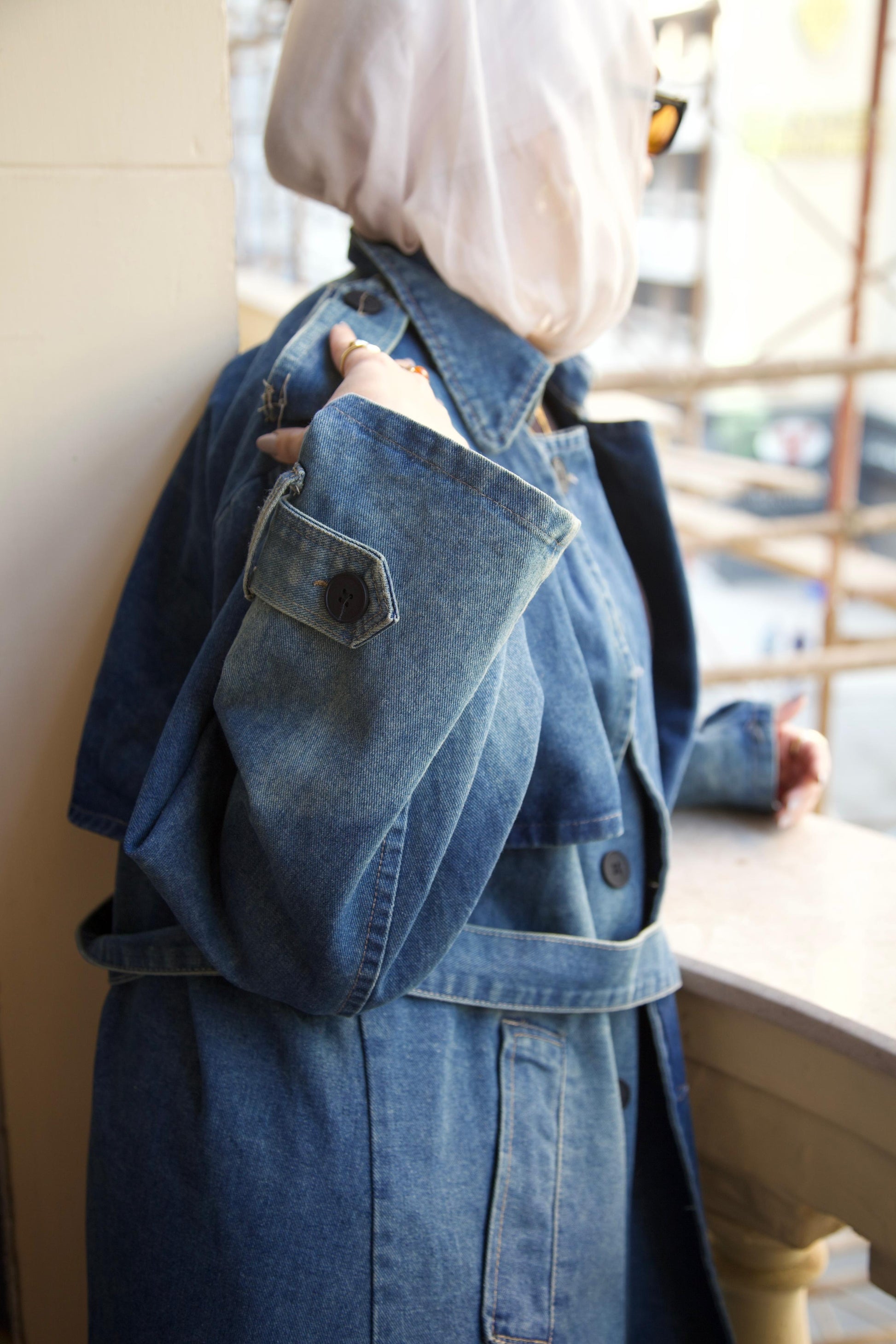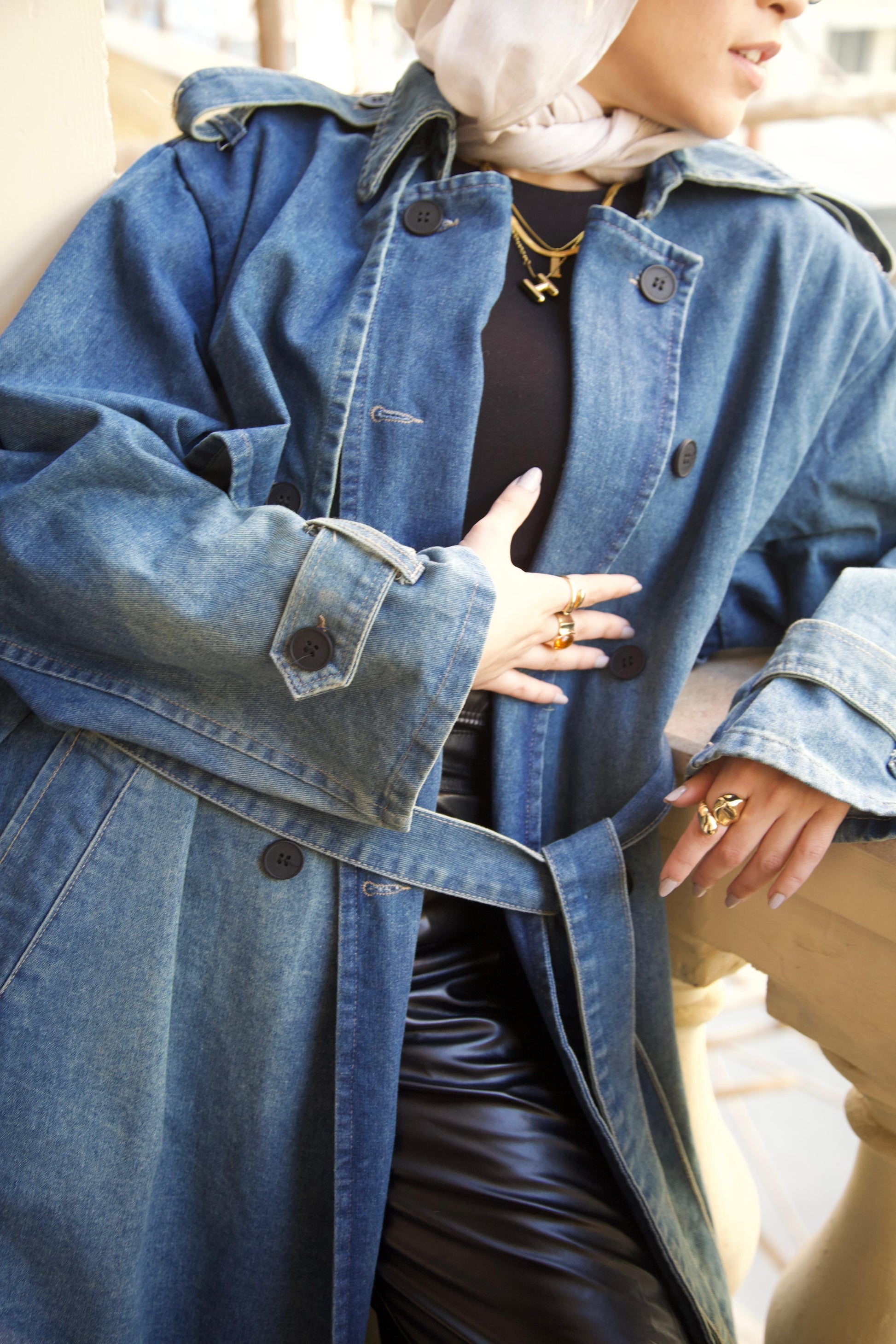 Crafted from premium denim, the coat is finished with statement buttons, wide sleeves, and a self-tie belt that allows for versatile styling — worn open for a relaxed feel or cinched for a defined shape.