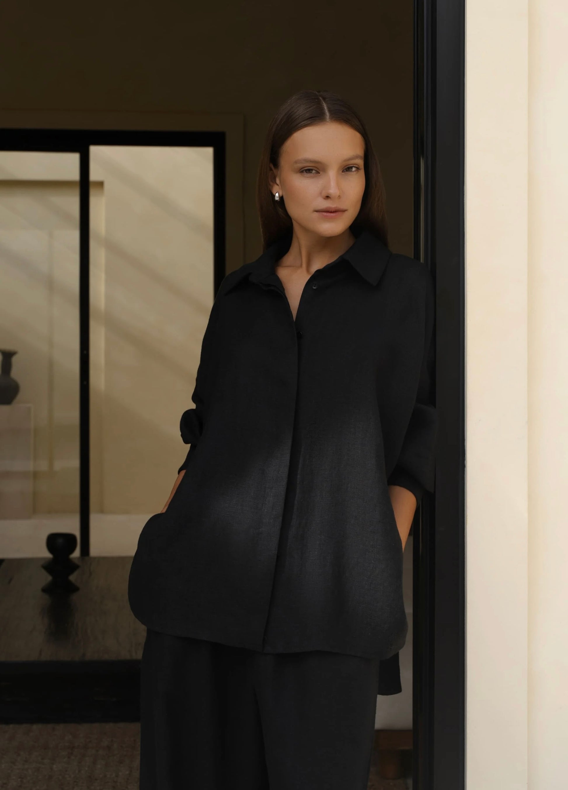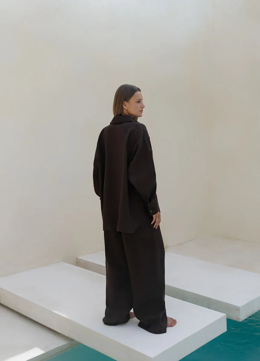 This 100% linen suit features a loose-fitting shirt and straight-leg trousers. The classic collar and button-up shirt creates a neat look, while the dropped shoulders add a soft touch. The high-waist trousers with an elastic waistband create a clear vertical line and visually elongate the silhouette. The lightweight linen drapes beautifully and maintains a comfortable feel throughout the day.